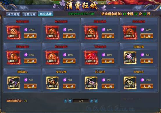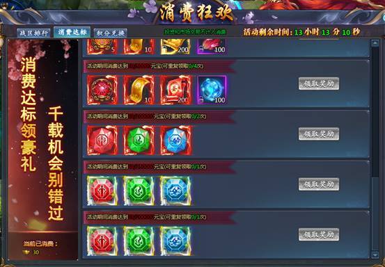 消费1元宝获得1消费积分,积分达标可领取相应奖励,获得的积分可在积分兑换商城兑换相应的道具奖励,积分兑换后对积分排行榜没有影响。