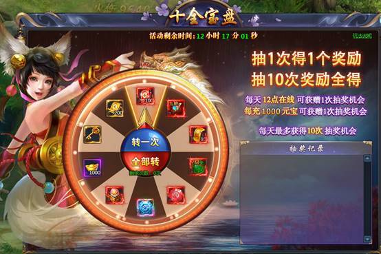 活动期间每天一期,每充值1000元宝可获得一次抽奖机会,每天最多获得10次抽奖机会,宝盘内物品全部抽取完毕为止,次日刷新。
