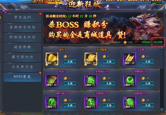 参与或者击杀boss即能获得积分,积分可兑换多重稀有道具奖励,详细积分获得规则请点击积分详情查看。
