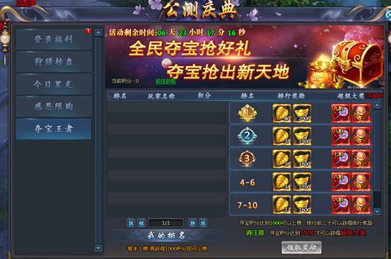 活动期间,玩家到藏宝阁内抽取奖励即可获得夺宝积分