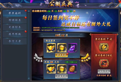 《御魂九霄》公测开启的同时,游戏将将全面启动“公测盛典”系列活动。签到即可获得绝版神兵皮肤——花心萝卜;参与击杀秘境BOSS、混沌BOSS、天界BOSS、神殿BOSS等均可获得狩猎积分参与抽奖;充值惊喜、感恩限购、夺宝王者等公测活动也将同步开启。所有公测庆典活动将在开服后持续7天,持续不断为玩家送上惊喜好礼。