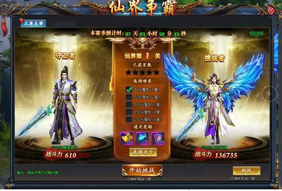 挑战时可以根据自身实力,选择守卫者的难度(10%属性,50%属性,100%属性,150%属性,200%属性)