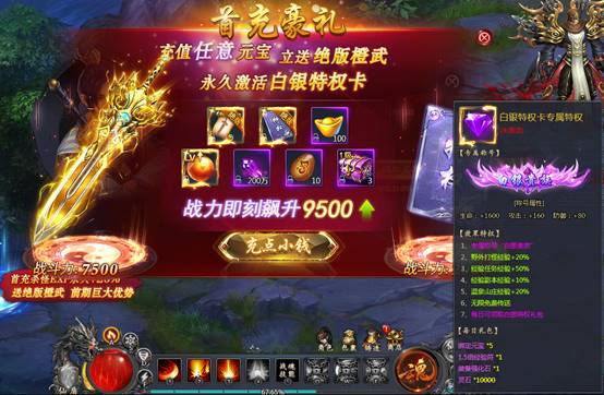 一、首先首充是一定要买的!前期送绝版橙武,没有这个之后的武器部位提升也无法进行下去了,首充赠送的白银特权增加各种经验加成,帮助您更快升级。