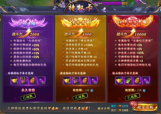 花费1588元宝可获得“三阶·天界圣武”,全民提升人物攻防血属性。
